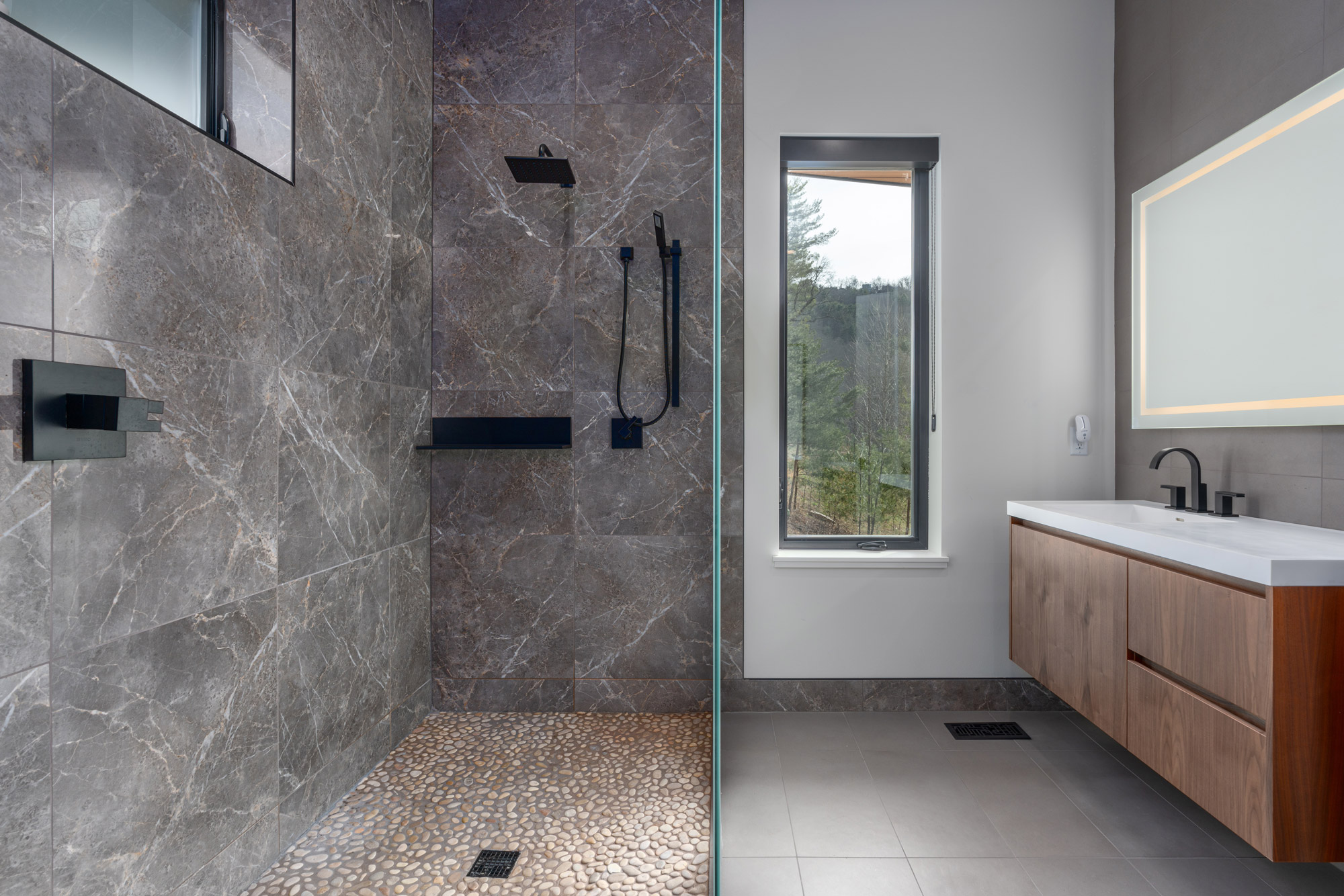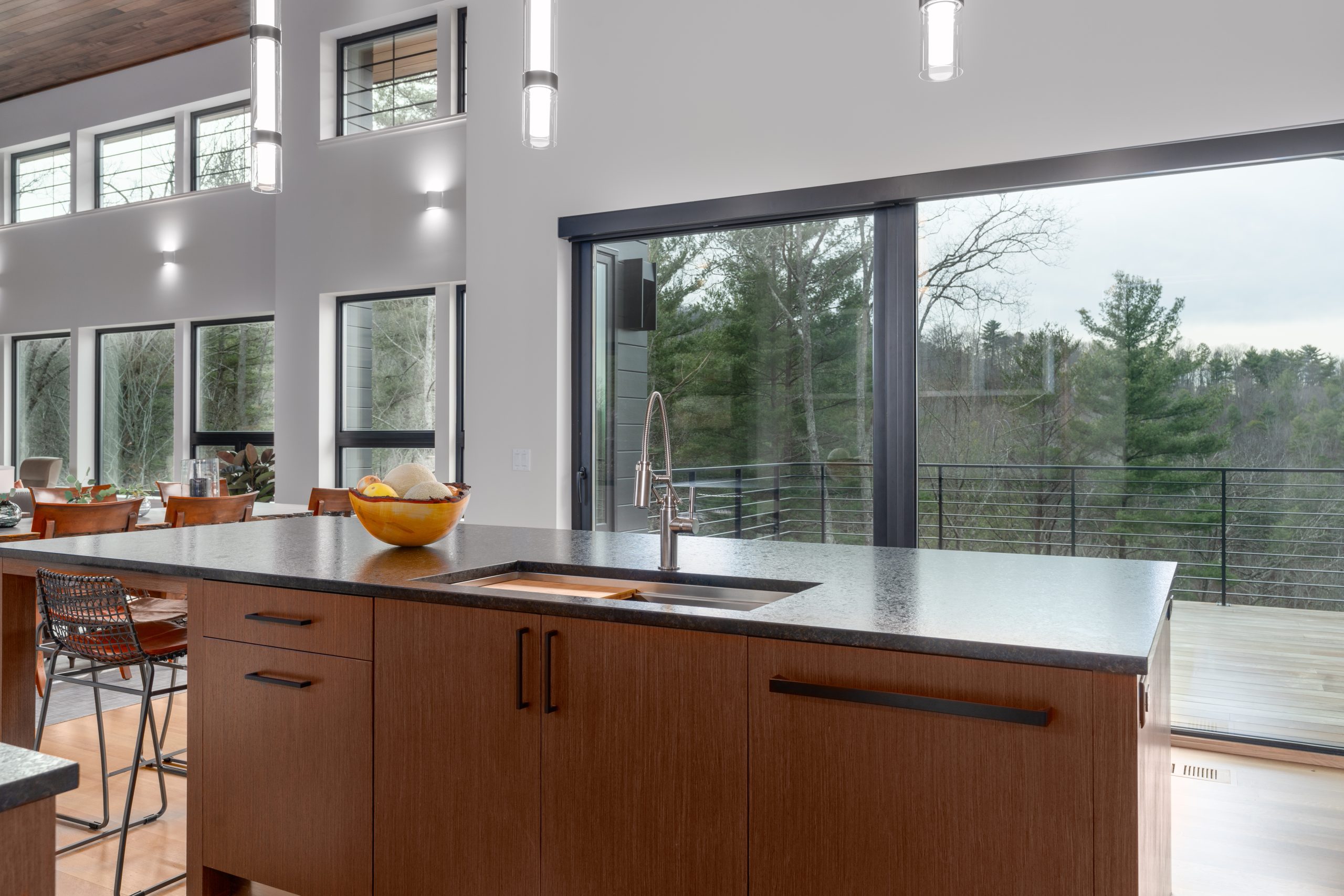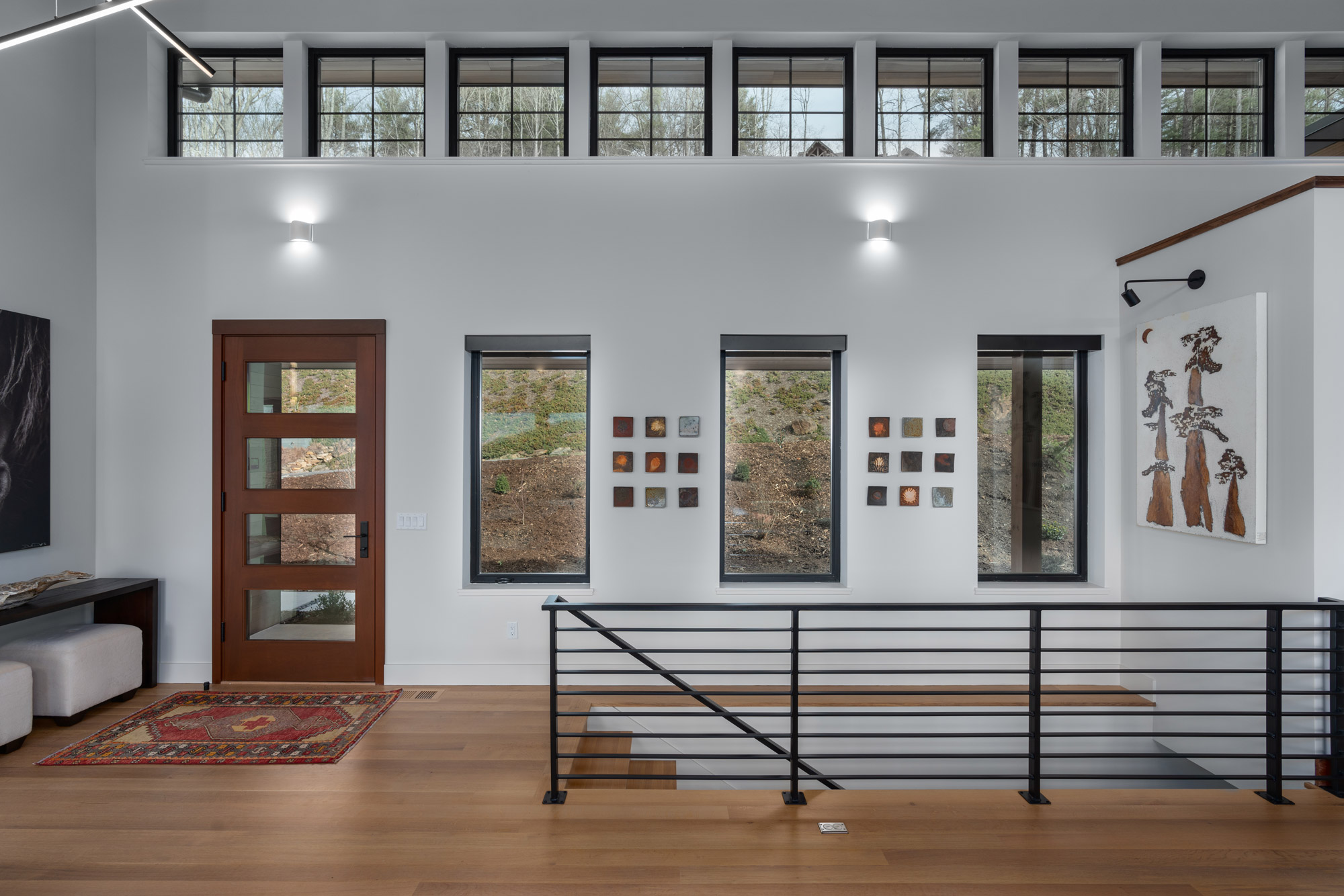 Challenging build on an extremely steep slope, this contemporary home is one of the most energy-efficient homes built. Utilizing an 8′ exterior wall allowed for continuous insulation, increasing the efficiency of the thermal envelope. Combined with low windows, a high-performance heat pump, and other green building components, this home, at its core, is the definition of a Green Building.