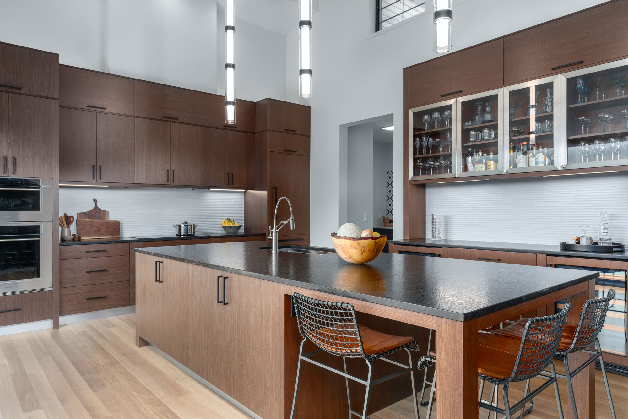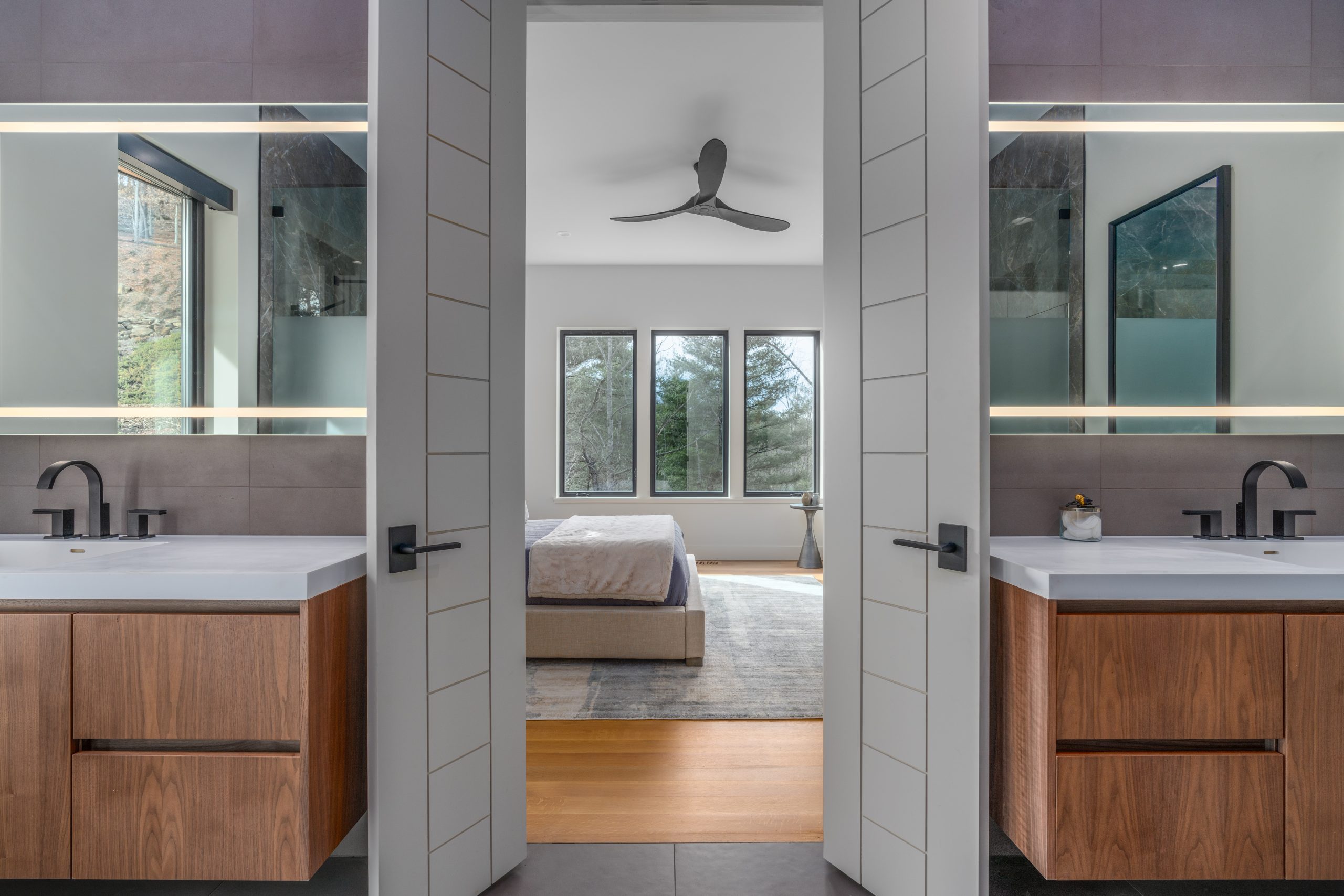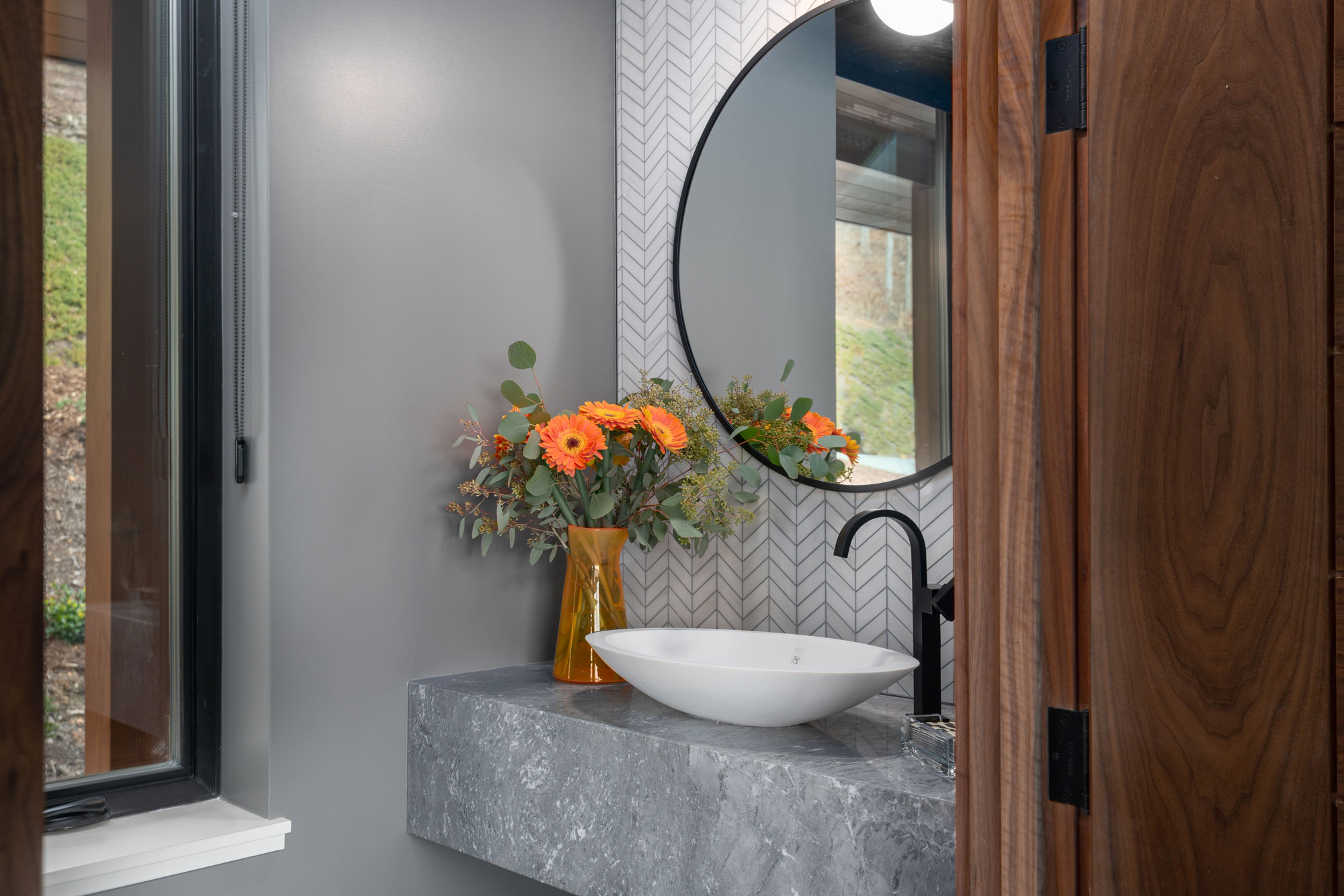 Challenging build on an extremely steep slope, this contemporary home is one of the most energy-efficient homes built. Utilizing an 8′ exterior wall allowed for continuous insulation, increasing the efficiency of the thermal envelope. Combined with low windows, a high-performance heat pump, and other green building components, this home, at its core, is the definition of a Green Building.