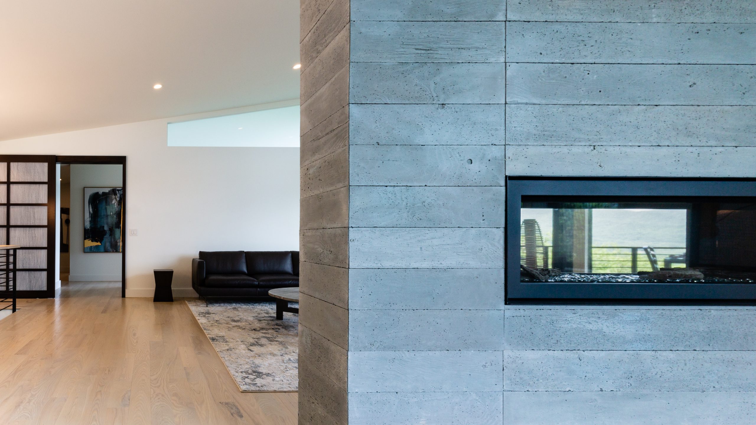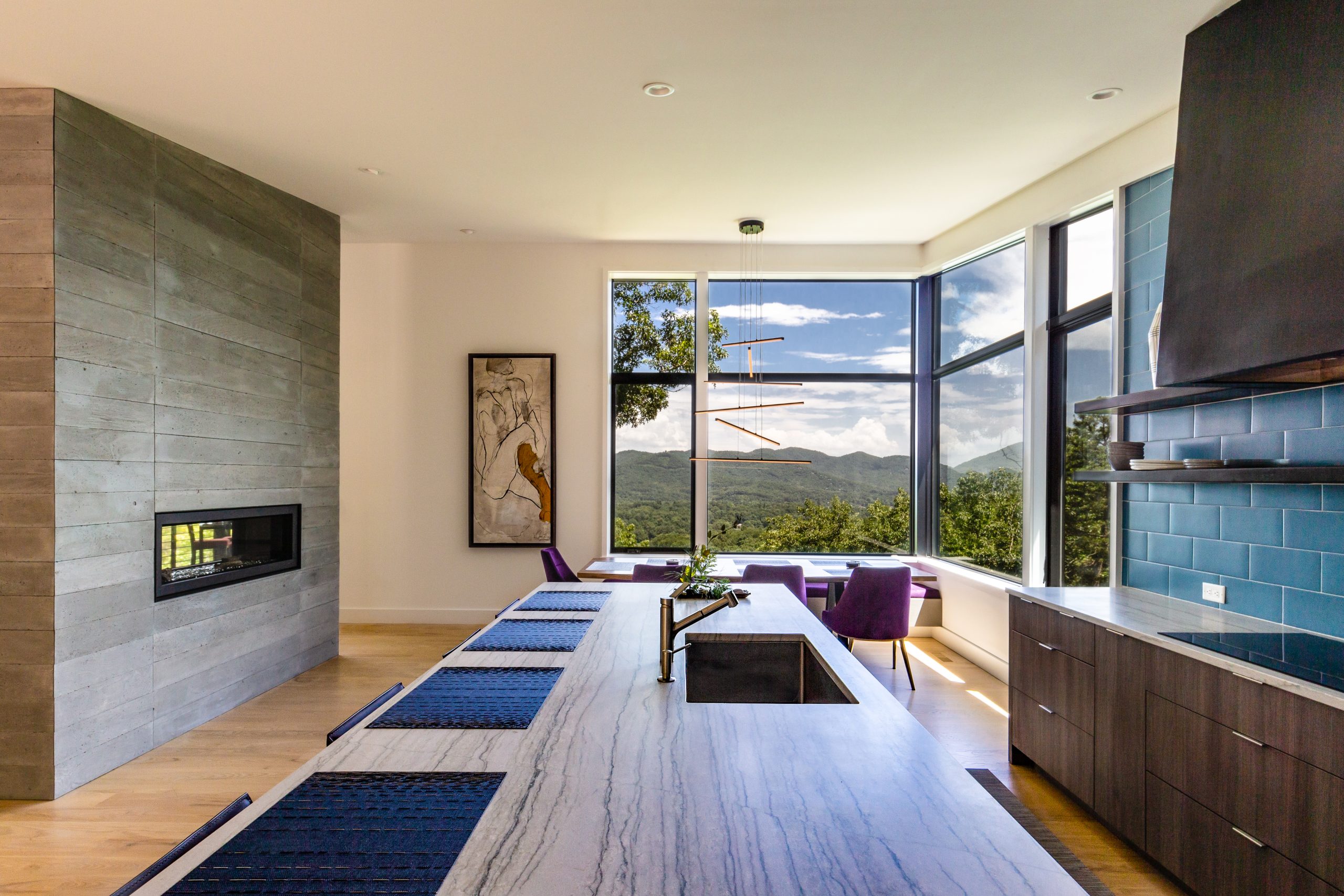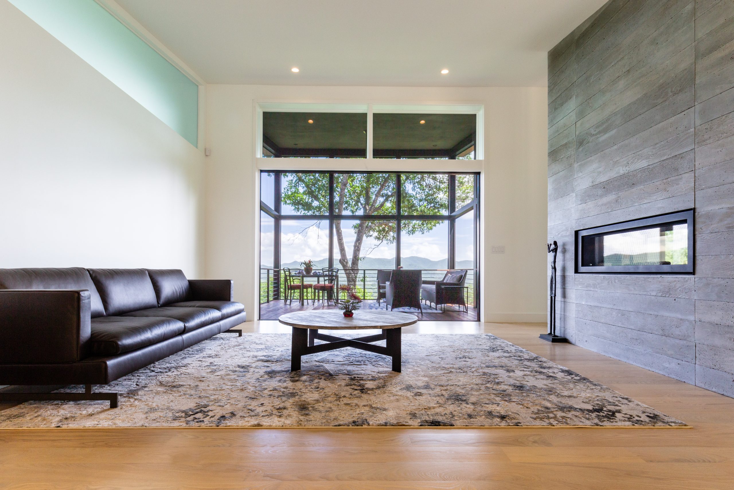 The cantilevered architectural style of this home creates the impression of living amidst the canopy of trees. A combination of materials used both inside and outside the house contributes to its sleek, contemporary appearance.